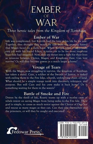 Three heroic tales from the Kingdom of Xonthian. Ember of War Life was complicated, but Korrith had the love of his life by his side. Together, they thought they would be safe from the growing hatred that Mages faced on a daily basis. When Korrith takes a supposedly easy job with his friend Edrin, it turns out to be far more insidious than they had imagined. Now, they are thrust into a fight for their lives as tensions between Clerics, Mages, and Kingdoms flare. Can love survive? Or will they become pawns in a much larger scheme? Voyage of Tears With the Mages now struggling to survive, the kingdom of Xonthian has taken a stand. Cain, a soldier in the Swords of Justice, is tasked with exiling them to the Fire Isles, a harsh, unforgiving chain of land. What should be a simple voyage turns into discovery, tolerance, and purpose. But will Cain and his crew make it back home? Or is something waiting for them in the waters? Battle of Smoke and Fire Driven by the thrill of life, Roaric teams up with a motley crew of rebels intent on saving Mages from being exiles to the Fire Isle. Their goal is simple, to cause as much terror against the Clerics of Gate'har and rescue as many mages as they can. Can they save themselves and the prisoners, or will they be caught and executed?
