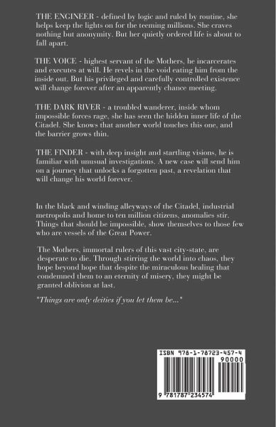 THE ENGINEER – defined by logic and ruled by routine, she helps keep the lights on for the teeming millions. She craves nothing but anonymity. But her quietly ordered life is about to fall apart. THE VOICE – highest servant of the Mothers, he incarcerates and executes at will. He revels in the void eating him from the inside out. But his privileged and carefully controlled existence will change forever after an apparently chance meeting. THE DARK RIVER – a troubled wanderer, inside whom impossible forces rage, she has seen the hidden inner life of the Citadel. She knows that another world touches this one, and the barrier grows thin. THE FINDER – with deep insight and startling visions, he is familiar with unusual investigations. A new case will send him on a journey that unlocks a forgotten past, a revelation that will change his world forever. In the black and winding alleyways of the Citadel, industrial metropolis and home to ten million citizens, anomalies stir. Things that should be impossible, show themselves to those few who are vessels of the Great Power. The Mothers, immortal rulers of this vast city-state, are desperate to die. Through stirring the world into chaos, they hope beyond hope that despite the miraculous healing that condemned them to an eternity of misery, they might be granted oblivion at last. "Things are only deities if you let them be…"