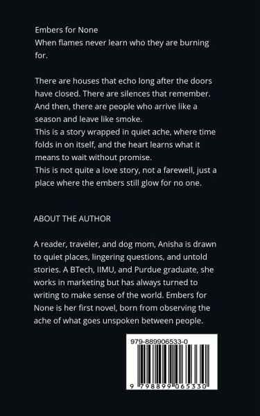 Embers for None When flames never learn who they are burning for. Grief does not always arrive with a ceremony. Sometimes, it lingers quietly for years. It comes in snippets in the pauses of a song, in an unfinished sketch, in the way someone avoids a familiar road without knowing why. 'Embers for None' is not a love story. It is the quiet haunting of an absence, unshaped, unnamed. It is the tale of things we carry long after they have stopped belonging to us. It is the slow unravelling of a tether stretched between two lives that never found the same rhythm. It is about a girl who tried to outrun the memory of someone she never stopped feeling. And a man who wrote letters he never meant to send. About the slow undoing of what could have been, and the unspoken tenderness that survives long after the last goodbye. Some stories end with silence. But some silences remember everything.