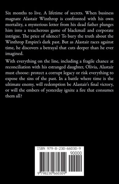 Six months to live. A lifetime of secrets. When business magnate Alastair Winthrop is confronted with his own mortality, a mysterious letter from his dead father plunges him into a treacherous game of blackmail and corporate intrigue. The price of silence? To bury the truth about the Winthrop Empire's dark past. But as Alastair races against time, he discovers a betrayal that cuts deeper than he ever imagined. With everything on the line, including a fragile chance at reconciliation with his estranged daughter, Olivia, Alastair must choose: protect a corrupt legacy or risk everything to expose the sins of the past. In a battle where time is the ultimate enemy, will redemption be Alastair's final victory, or will the embers of yesterday ignite a fire that consumes them all?