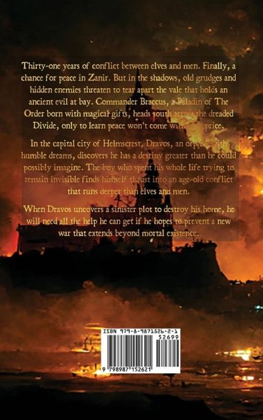 Thirty-one years of conflict between elves and men. Finally, a chance for peace in Zanir. But in the shadows, old grudges and hidden enemies threaten to tear apart the vale that holds an ancient evil at bay. Commander Braccus, a Paladin of The Order born with magical gifts, heads south across the dreaded Divide, only to learn peace won't come without a price. In the capital city of Helmscrest, Dravos, an orphan with humble dreams, discovers he has a destiny greater than he could possibly imagine. The boy who spent his whole life trying to remain invisible finds himself thrust into an age-old conflict that runs deeper than elves and men. When Dravos uncovers a sinister plot to destroy his home, he will need all the help he can get if he hopes to prevent a new war that extends beyond mortal existence.