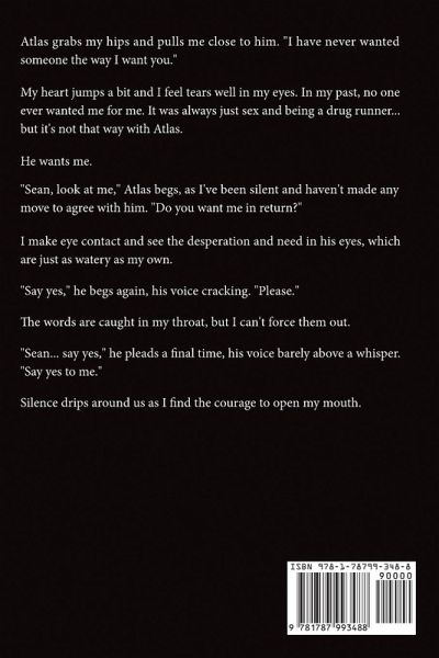 Atlas grabs my hips and pulls me close to him. "I have never wanted someone the way I want you." My heart jumps a bit and I feel tears well in my eyes. In my past, no one ever wanted me for me. It was always just sex and being a drug runner... but it's not that way with Atlas. He wants me. "Sean, look at me," Atlas begs, as I've been silent and haven't made any move to agree with him. "Do you want me in return?" I make eye contact and see the desperation and need in his eyes, which are just as watery as my own. "Say yes," he begs again, his voice cracking. "Please." The words are caught in my throat, but I can't force them out. "Sean... say yes," he pleads a final time, his voice barely above a whisper. "Say yes to me." Silence drips around us as I find the courage to open my mouth.