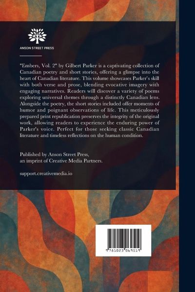 "Embers, Vol. 2" by Gilbert Parker is a captivating collection of Canadian poetry and short stories, offering a glimpse into the heart of Canadian literature. This volume showcases Parker's skill with both verse and prose, blending evocative imagery with engaging narratives. Readers will discover a variety of poems exploring universal themes through a distinctly Canadian lens. Alongside the poetry, the short stories included offer moments of humor and poignant observations of life. This meticulously prepared print republication preserves the integrity of the original work, allowing readers to experience the enduring power of Parker's voice. Perfect for those seeking classic Canadian literature and timeless reflections on the human condition. This work has been selected by scholars as being culturally important, and is part of the knowledge base of civilization as we know it. This work is in the public domain in the United States of America, and possibly other nations. Within the United States, you may freely copy and distribute this work, as no entity (individual or corporate) has a copyright on the body of the work. Scholars believe, and we concur, that this work is important enough to be preserved, reproduced, and made generally available to the public. We appreciate your support of the preservation process, and thank you for being an important part of keeping this knowledge alive and relevant.
