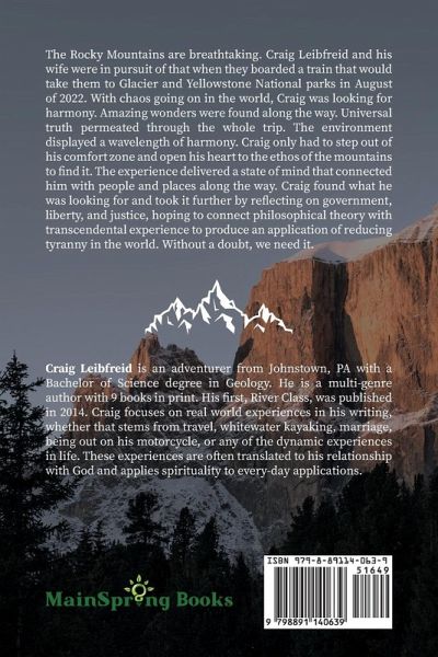 The Rocky Mountains are breathtaking. Craig Leibfreid and his wife were in pursuit of that when they boarded a train that would take them to Glacier and Yellowstone National parks in August of 2022. With chaos going on in the world, Craig was looking for harmony. Amazing wonders were found along the way. Universal truth permeated through the whole trip. The environment displayed a wavelength of harmony. Craig only had to step out of his comfort zone and open his heart to the ethos of the mountains to find it. The experience delivered a state of mind that connected him with people and places along the way. Craig found what he was looking for and took it further by reflecting on government, liberty, and justice, hoping to connect philosophical theory with transcendental experience to produce an application of reducing tyranny in the world. Without a doubt, we need it.