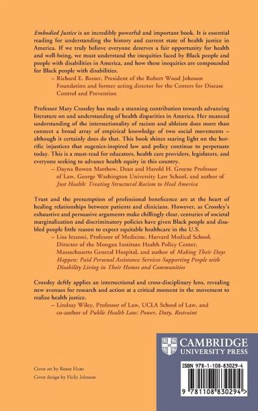 Black people and people with disabilities in the United States are distinctively disadvantaged in their encounters with the health care system. These groups also share harsh histories of medical experimentation, eugenic sterilizations, and health care discrimination. Yet the similarities in inequities experienced by Black people and disabled people and the harms endured by people who are both Black and disabled have been largely unexplored. To fill this gap, Embodied Injustice uses an interdisciplinary approach, weaving health research with social science, critical approaches, and personal stories to portray the devastating effects of health injustice in America. Author Mary Crossley takes stock of the sometimes-vexed relationship between racial justice and disability rights advocates and interrogates how higher disability prevalence among Black Americans reflects unjust social structures. By suggesting reforms to advance health equity for disabled people, Black people, and disabled Black people, this book lays a crucial foundation for intersectional, cross-movement advocacy to advance health justice in America.