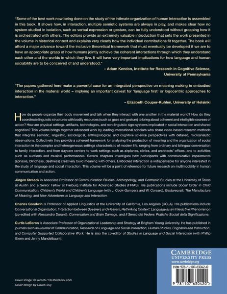 How do people organize their body movement and talk when they interact with one another in the material world? How do they coordinate linguistic structures with bodily resources (such as gaze and gesture) to bring about coherent and intelligible courses of action? How are physical settings, artifacts, technologies and non-linguistic sign-systems implicated in social interaction and shared cognition? This volume brings together advanced work by leading international scholars who share video-based research methods that integrate semiotic, linguistic, sociological, anthropological and cognitive science perspectives with detailed, microanalytic observations. Collectively they provide a coherent framework for analyzing the production of meaning and the organization of social interaction in the complex and heterogeneous settings that are characteristic of modern life. Embodied Interaction is indispensable for anyone interested in the study of language and social interaction. This volume will be a point of reference for future research on multimodality in human communication and action.