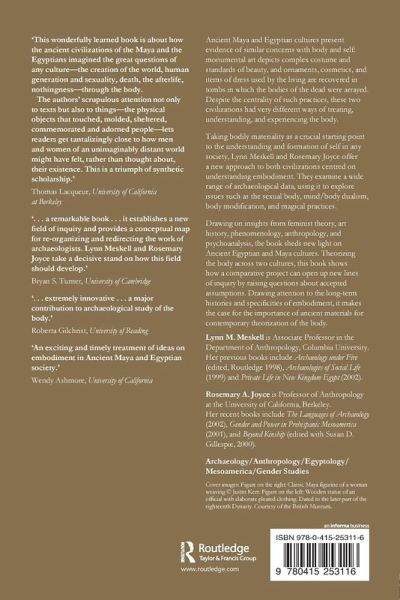 Examining a wide range of archaeological data, and using it to explore issues such as the sexual body, mind/body dualism, body modification, and magical practices, Lynn Meskell and Rosemary Joyce offer a new approach to the Ancient Egyptian and Mayan understanding of embodiment. Drawing on insights from feminist theory, art history, phenomenology, anthropology and psychoanalysis, the book takes bodily materiality as a crucial starting point to the understanding and formation of self in any society, and sheds new light on Ancient Egyptian and Maya cultures. The book shows how a comparative project can open up new lines of inquiry by raising questions about accepted assumptions as the authors draw attention to the long-term histories and specificities of embodiment, and make the case for the importance of ancient materials for contemporary theorization of the body. For students new to the subject, and scholars already familiar with it, this will offer fresh and exciting insights into these ancient cultures.