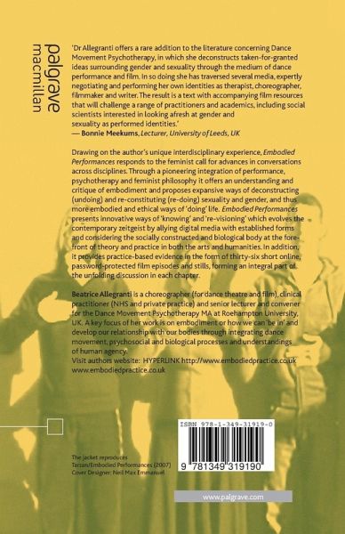 'Dr Allegranti offers a rare addition to the literature concerning Dance Movement Psychotherapy, in which she deconstructs taken-for-granted ideas surrounding gender and sexuality through the medium of dance performance and film. In so doing she has traversed several media, expertly negotiating and performing her own identities as therapist, choreographer, film maker and writer. The result is a text with accompanying film resources that will challenge a range of practitioners and academics, including social scientists interested in looking afresh at gender and sexuality as performed identities.' - Bonnie Meekums, Lecturer, University of Leeds, UK