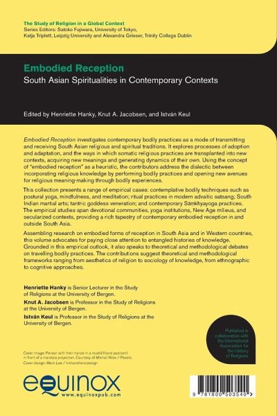 Embodied Reception investigates contemporary bodily practices as a mode of transmitting and receiving South Asian religious and spiritual traditions. It explores processes of adoption and adaptation, and the ways in which somatic religious practices are transplanted into new contexts, acquiring new meanings and generating dynamics of their own. Using the concept of "embodied reception" as a heuristic, the contributors address the dialectic between incorporating religious knowledge by performing bodily practices and opening new avenues for religious meaning-making through bodily experiences.This collection presents a range of empirical cases: contemplative bodily techniques such as postural yoga, mindfulness, and meditation; ritual practices in modern advaitic satsang; South Indian martial arts; tantric goddess veneration; and contemporary S¿¿khyayoga practices. The empirical studies span devotional communities, yoga institutions, New Age milieus, and secularized contexts, providing a rich tapestry of contemporary embodied reception in and outside South Asia.Assembling research on embodied forms of reception in South Asia and in Western countries, this volume advocates for paying close attention to entangled histories of knowledge. Grounded in this empirical outlook, it also speaks to theoretical and methodological debates on travelling bodily practices. The contributions suggest theoretical and methodological frameworks ranging from aesthetics of religion to sociology of knowledge, from ethnographic to cognitive approaches.