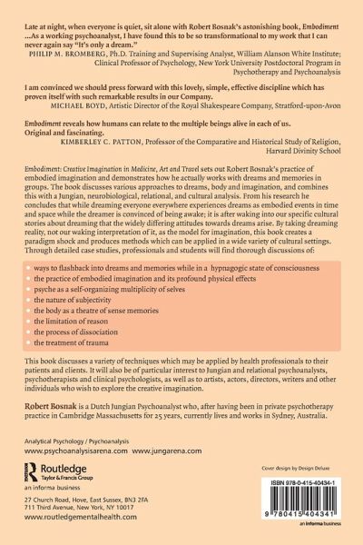 "Late at night, when everyone is quiet, sit alone with Robert Bosnak's astonishing book, Embodiment, and allow him to accompany you on an exciting journey that is at once physical, spiritual, psychological, and astonishingly compatible with current data from neuroscience and cognitive science. As a working psychoanalyst, I have found this to be so transformational to my work that I can never again say 'It's only a dream'." - Philip M. Bromberg, Training and Supervising Analyst, William Alanson White Institute; Clinical Professor of Psychology, New York University Postdoctoral Program in Psychotherapy and Psychoanalysis, USA
