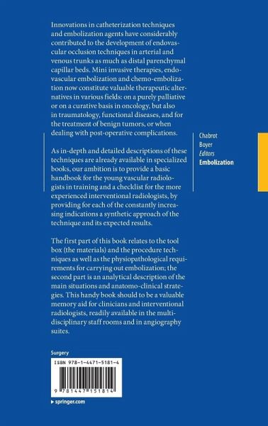 1. The Tool Box: Catheterization Devices and Embolization Agents.- 2. Vascular Occlusions and Parenchymal Embolizations: Principles.- 3. Hemorrhages of the ENT Area.- 4. Massive Hemoptysis: Radiological Management.- 5. Embolization of the Pulmonary Artery.- 6. Hepatic Artery Embolization.- 7. Chemoembolizations and Hepatic Intra Arterial Chemotherapies.- 8. Portal Vein Embolization.- 9. Splenic Arterial Embolization.- 10. Gastro Intestinal Tract Arterial Haemorrhages.- 11. True and false Aneurysms of Visceral and Renal Arteries.- 12. Hypogastric Arteries: Aneurysms, Occlusions Before Stent-Grafting.- 13. Renal Arterial Embolizations.- 14. Anticoagulant Related Hematomas.- 15. Embolization of Varicoceles.- 16. Embolization of the Internal Pudendal Arteries for High Flow Priapism.- 17. Embolization of Endoleaks Ater Endovascular Abdominal Aortic Aneurysms Repair (EVAR).- 18. Post Partum Haemorrhages.- 19. Uterine Fibroid Embolization (UFE).- 20. Pelvi-Perineal Venous Insufficiency.- 21. Embolizations of Abdominal and Pelvic Traumas.- 22. Traumatisms of the Limbs.- 23. Management of Vascular Malformations.- 24. Miscellaneous/Marginal/Evolving Indications (Other Abdomino-Pelvic Tumors, Portal Hypertension Related Varicose Veins, Osteoarticular Pathologies)