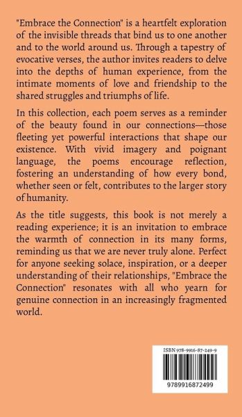 "Embrace the Connection" is a heartfelt exploration of the invisible threads that bind us to one another and to the world around us. Through a tapestry of evocative verses, the author invites readers to delve into the depths of human experience, from the intimate moments of love and friendship to the shared struggles and triumphs of life. In this collection, each poem serves as a reminder of the beauty found in our connections-those fleeting yet powerful interactions that shape our existence. With vivid imagery and poignant language, the poems encourage reflection, fostering an understanding of how every bond, whether seen or felt, contributes to the larger story of humanity. As the title suggests, this book is not merely a reading experience; it is an invitation to embrace the warmth of connection in its many forms, reminding us that we are never truly alone. Perfect for anyone seeking solace, inspiration, or a deeper understanding of their relationships, "Embrace the Connection" resonates with all who yearn for genuine connection in an increasingly fragmented world.