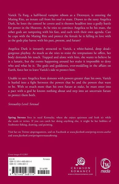 Varick Ta Farg, a half-breed vampire reborn as a Destroyer, is entering the Mating Rite, an innate call from his soul to mate. Drawn to sassy Angelica Dark, he loses the control he covets and is thrown head first into a godly battle for power in the Heavens. As he tries to convince Angelica to be his mate, the other gods are tampering with his fate, each with their own agenda. Can he cope with the Mating Rite and protect the female he is falling in love with as the gods play havoc with his past, present, and future? Angelica Dark is instantly attracted to Varick, a white-haired, drop-dead gorgeous playboy. As much as she tries to resist the temptations he offers, her body demands his touch. Trapped and alone with him, she wants to believe he is a lunatic, but the events happening around her mean she cannot deny what and who he is. The gods and goddesses, ever meddling in the affairs on earth, force her into leaving his side to protect him. Unable to save Angelica from the demons with powers greater than his own, Varick is hurled into a fight between the powers that be and the powers that want to be. With so much more than his own future at stake, he must enter into a pact with a god he knows nothing about and step into an uncertain future to protect them both. Sensuality Level: Sensual