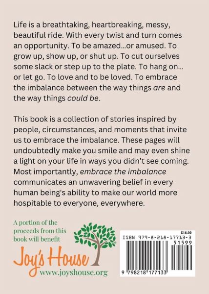 Life is a breathtaking, heartbreaking, messy, beautiful ride. With every twist and turn comes an opportunity. To be amazed...or amused. To grow up, show up, or shut up. To cut ourselves some slack or step up to the plate. To hang on...or let go. To love and to be loved. To embrace the imbalance between the way things are and the way things could be. This book is a collection of stories inspired by people, circumstances, and moments that invite us to embrace the imbalance. These pages will undoubtedly make you smile and may even shine a light on your life in ways you didn't see coming. Most importantly, embrace the imbalance communicates an unwavering belief in every human being's ability to make our world more hospitable to everyone, everywhere.