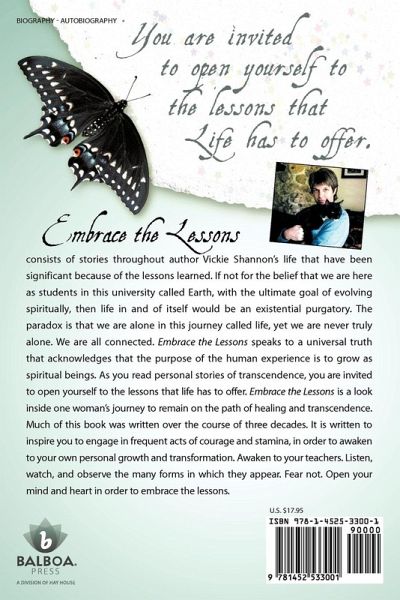 This book was not intended to be about me. It is a memoir, yet, I truly do not consider myself so significant that anyone would want to read my memoirs. It consists of stories throughout my life that have been significant because of the lessons learned. If not for the belief that I am here as a student, in this University called Earth, with the ultimate goal of evolving spiritually, then life in and of itself would be an existential purgatory. I write to teach. The paradox is that we are alone in this journey called life, yet we are never truly alone. We are all connected. Embrace the Lessons speaks to a Universal truth that acknowledges that the purpose of the human experience is to grow as spiritual beings. I share with you my personal stories of transcendence, in the hopes that you will become open to your own. You are invited to open yourself to the lessons that Life has to offer. Embrace the Lessons is a look inside one woman's journey to remain on the path of healing and transcendence. Much of this book was written over the course of three decades. It is packed with insight and inspiration. It is thought provoking, heart-felt, and entertaining. It is written for you. It is written to inspire you to engage in frequent acts of courage and stamina in order to awaken to your own personal growth and transformation. Awaken to your Teachers. Listen, watch, and observe the many forms in which they appear. Fear not. Open your mind and heart in order to Embrace the Lessons.