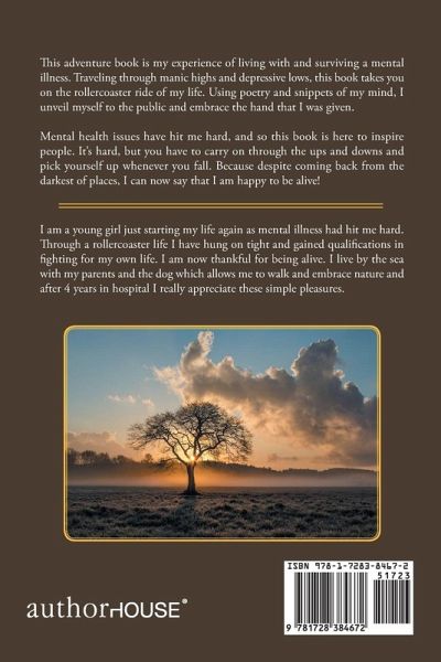 This adventure book is my experience of living with and surviving a mental illness. Traveling through manic highs and depressive lows, this book takes you on the rollercoaster ride of my life. Using poetry and snippets of my mind, I unveil myself to the public and embrace the hand that I was given. Mental health issues have hit me hard, and so this book is here to inspire people. It's hard, but you have to carry on through the ups and downs and pick yourself up whenever you fall. Because despite coming back from the darkest of places, I can now say that I am happy to be alive!