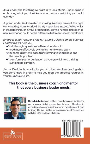 As a leader, the last thing we want is to look stupid. But imagine if embracing what you don't know was the smartest thing you could ever do? A great leader isn't invested in looking like they have all the right answers; they learn to ask all the right questions instead. Whether it's in life, leadership, or in your organization, staying humble and open to new information could be the difference between success and failure. Embrace What You Don't Know: A Stupid Guide to Smart Business Leadership will help you: ask the right questions in life and leadership lead more effectively by staying humble and open become a better leader, transforming your business and the people you lead transform your organization as you grow it into a thriving, sustainable company Author David Achata will take you on a journey of embracing what you don't know in order to help you reap the greatest rewards in your business and life. This book is the business coach and mentor that every business leader needs.