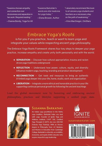 Do you want to be on the cutting edge of the future of yoga? If you desire an authentic yoga practice embracing ancient yogic philosophy and traditions but don't know how to embody that knowledge with integrity in today's modern yoga culture, Embrace Yoga's Roots is your guide to honor and not appropriate yoga. "When we mistake yoga for a workout routine, reduce it to physical fitness or even do some of the deeper aspects of yoga without an eye to the whole system of liberation it offers, we rob ourselves and each other of the potential of this practice," says Susanna Barkataki. Embrace Yoga's Roots explores the past's yogic traditions, brings them alive today, and preserves them for the future by examining what separates us, reflecting on our part, taking action for equity and moving toward liberation together. If you practice, teach or want to learn yoga integrating your ethics and values while respecting ancient yoga philosophy, you have found the essential guide to making that goal a reality. "I can't think of anyone more suited to lead the way to embrace yoga's roots than Susanna. This book should be required reading in yoga teacher trainings across the world." Rachel Brathen - author of the New York Times Bestseller Yoga Girl The Embrace Yoga Roots Framework revealed in this book shares four keys steps to deepen your yoga practice, increase empathy and create unity both personally and with the world.Separation: Learning how colonization, cultural appropriation, and oppression results in trauma for yogis and separation from yoga traditions. Reflection: Understanding the causes of separation and our roles, either supporting separation (knowingly or not) versus creating unity and equity in yoga. Reconnection: Exploring specific and concrete skills and solutions for living and practicing yoga as unity, inspiring global transformation. Liberation: Integrating a more honorable and ethical practice in your life supporting personal growth by following the ancient teachings. Barkataki shares tools, resources and gentle guidance demonstrating how you can embody a complete yoga practice that includes and extends beyond the physical, the mindful and the sacred to something equitable, inclusive and accessible for everyone on all levels of their being. This book is more than a textbook on yoga's history but a practical guide offering reflective questions for the personal exploration of challenging topics leading to personal and social transformation. Embrace Yoga's Roots shows you how to take this awakened understanding and vital message into your local yoga community, helping to connect you with the yoga community worldwide. Lead the global movement now by honoring and embracing ancient philosophies, practices and lifestyles supporting a unified yogic state.