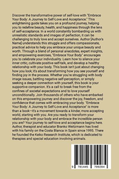 Discover the transformative power of self-love with "Embrace Your Body: A Journey to Self-Love and Acceptance." This enlightening guide takes you on a profound journey, helping you to redefine beauty, health, and happiness through the lens of self-acceptance. In a world constantly bombarding us with unrealistic standards and images of perfection, it can be challenging to truly love and accept ourselves. Author [Author's Name] understands this struggle and offers compassionate, practical advice to help you embrace your unique beauty and worth. Through a blend of personal anecdotes, expert insights, and empowering exercises, "Embrace Your Body" encourages you to celebrate your individuality. Learn how to silence your inner critic, cultivate positive self-talk, and develop a healthy relationship with your body. This book isn't just about changing how you look; it's about transforming how you see yourself and finding joy in the process. Whether you're struggling with body image issues, battling negative self-perception, or simply seeking a deeper connection with yourself, this book is your supportive companion. It's a call to break free from the confines of societal expectations and to love yourself unconditionally. Join thousands of others who have embarked on this empowering journey and discover the joy, freedom, and confidence that comes with embracing your body. "Embrace Your Body: A Journey to Self-Love and Acceptance" is more than a book-it's a movement towards a kinder, more accepting world, starting with you. Are you ready to transform your relationship with your body and embrace the incredible person you are? Your journey to self-love and acceptance begins here.