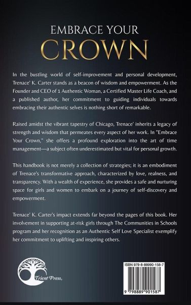"Embrace Your Crown: A Time Management Handbook" by Trenace' K. Carter In the bustling world of self-improvement and personal development, Trenace' K. Carter stands as a beacon of wisdom and empowerment. As the Founder and CEO of 1 Authentic Woman, a Certified Master Life Coach, and a published author, her commitment to guiding individuals towards embracing their authentic selves is nothing short of remarkable. Raised amidst the vibrant tapestry of Chicago, Trenace' inherits a legacy of strength and wisdom that permeates every aspect of her work. In "Embrace Your Crown," she offers a profound exploration into the art of time management-a subject often underestimated but vital for personal growth. This handbook is not merely a collection of strategies; it is an embodiment of Trenace's transformative approach, characterized by love, realness, and transparency. With a wealth of experience, she provides a safe and nurturing space for girls and women to embark on a journey of self-discovery and empowerment. Trenace' K. Carter's impact extends far beyond the pages of this book. Her involvement in supporting at-risk girls through The Communities in Schools program and her recognition as an Authentic Self Love Specialist exemplify her commitment to uplifting and inspiring others. As a resident of Houston, she is not only a proud mother but also a grandmother who understands the delicate balance between personal growth and the demands of everyday life. Through her coaching, writing, and community engagement, Trenace' continues to guide individuals towards embracing their true selves, unlocking their potential, and ultimately, wearing their crown of authenticity with pride. "Embrace Your Crown" is not just a handbook; it is a testament to Trenace' K. Carter's unwavering dedication to helping individuals master the art of time management as a pathway to self-discovery and personal growth. This book is a vital addition to her impactful teachings, offering invaluable insights for those who aspire to reign over their lives with grace and purpose.