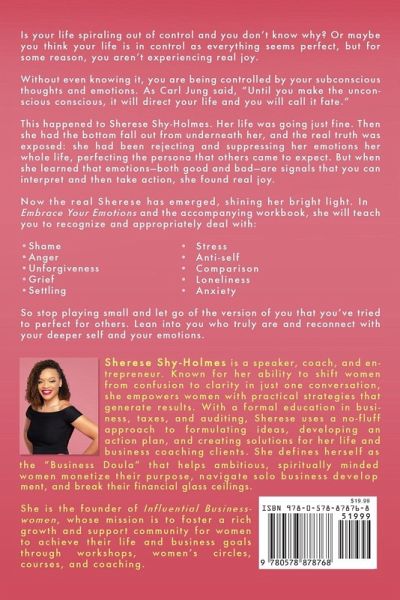 Is your life spiraling out of control and you don't know why? Or maybe you think your life is in control as everything seems perfect, but for some reason, you aren't experiencing real joy. Without even knowing it, you are being controlled by your subconscious thoughts and emotions. As Carl Jung said, "Until you make the unconscious conscious, it will direct your life and you will call it fate." This happened to Sherese Shy-Holmes. Her life was going just fine. Then she had the bottom fall out from underneath her, and the real truth was exposed: she had been rejecting and suppressing her emotions her whole life, perfecting the persona that others came to expect. But when she learned that emotions-both good and bad-are signals that you can interpret and then take action, she found real joy. Now the real Sherese has emerged, shining her bright light. In Embrace Your Emotions and the accompanying workbook, she will teach you to recognize and appropriately deal with: · Shame · Anger · Unforgiveness · Grief · Settling · Stress · Anti-self · Comparison · Loneliness · Anxiety So stop playing small and let go of the version of you that you've tried to perfect for others. Lean into you who truly are and reconnect with your deeper self and your emotions.