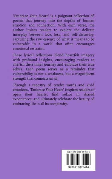 "Embrace Your Heart" is a poignant collection of poems that journey into the depths of human emotion and connection. With each verse, the author invites readers to explore the delicate interplay between love, loss, and self-discovery, capturing the raw essence of what it means to be vulnerable in a world that often encourages emotional restraint. These lyrical reflections blend heartfelt imagery with profound insights, encouraging readers to cherish their inner journey and embrace their true selves. Each poem serves as a reminder that vulnerability is not a weakness, but a magnificent strength that connects us all. Through a tapestry of tender words and vivid emotions, "Embrace Your Heart" inspires readers to open their hearts, find solace in shared experiences, and ultimately celebrate the beauty of embracing life in all its complexity.
