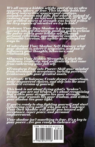 We all carry a hidden self-the part of us we often suppress, ignore, or fear. This shadow holds our deepest insecurities, unprocessed emotions, unspoken desires and gifts. But what if, instead of running from it, we learned to embrace it? What if our greatest source of strength was buried within the very aspects of ourselves we try to hide? Embrace Your Own Shadow is a transformative journey into self-discovery, guiding you to reclaim the power within your hidden self. Through personal reflections, psychological insights, and actionable exercises, the author gives insight on ways to: ¿Understand Your Shadow Self: Discover what your shadow is, where it originates, and how it influences your thoughts, behaviors, and relationships. ¿Harness Your Hidden Strengths: Unlock the resilience, creativity, and authenticity that come from embracing your full self. ¿Transform Fear into Power: Shift your mindset from avoidance to acceptance, turning perceived weaknesses into your greatest assets. ¿Cultivate Wholeness: Create deeper connections, make empowered choices, and step into the most authentic version of yourself. This book is not about fixing what's "broken"; because you are not broken. It's about recognizing that within your struggles lies your strength, within your wounds lies your wisdom, and within your shadow lies your light. If you're ready to stop fighting yourself and start embracing every part of who you are, Embrace Your Own Shadow will guide you toward self-acceptance, inner peace, and personal empowerment. Your shadow isn't something to fear. It's a key to your power. Are you ready to embrace it?