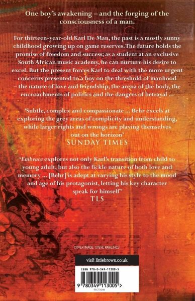 EMBRACE is the story of the awakening of Karl De Man a thirteen-year-old student at the Berg, an exclusive academy for boys in South Africa in the 1970s. Interwoven with the storyline about Karl at school are memories from Karl's childhood and first years at the Berg, presented as an ever-growing patchwork of the many influences on his development: growing up on a game reserve in East Africa, intensely aware of landscape and wildlife; a loving and close family, but a traditional one that will never easily accept Karl's true self: being sent away to school and the formation of new friendships and relationships. But, after threats and punishments handed out after casual sexual games in the dorm, Karl falls in love. He simultaneously has secret affairs with his best friend, Dominic, who is the son of liberal parents, and his choirmaster, Jacques Cilliers. The great strength of the novel is that it places Karl's passions on a wider canvas, focusing on his raw passions and elemental drives against the landscapes of Africa. It is a staggering follow-up to Mark Behr's award-winning first novel, THE SMELL OF APPLES.