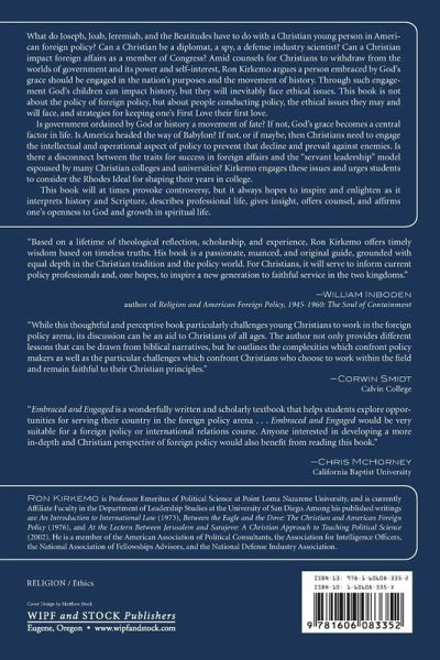 What do Joseph, Joab, Jeremiah, and the Beatitudes have to do with a Christian young person in American foreign policy? Can a Christian be a diplomat, a spy, a defense industry scientist? Can a Christian impact foreign affairs as a member of Congress? Amid counsels for Christians to withdraw from the worlds of government and its power and self-interest, Ron Kirkemo argues a person embraced by God's grace should be engaged in the nation's purposes and the movement of history. Through such engagement God's children can impact history, but they will inevitably face ethical issues. This book is not about the policy of foreign policy, but about people conducting policy, the ethical issues they may and will face, and strategies for keeping one's First Love their first love. Is government ordained by God or history a movement of fate? If not, God's grace becomes a central factor in life. Is America headed the way of Babylon? If not, or if maybe, then Christians need to engage the intellectual and operational aspect of policy to prevent that decline and prevail against enemies. Is there a disconnect between the traits for success in foreign affairs and the ""servant leadership"" model espoused by many Christian colleges and universities? Kirkemo engages these issues and urges students to consider the Rhodes Ideal for shaping their years in college. This book will at times provoke controversy, but it always hopes to inspire and enlighten as it interprets history and Scripture, describes professional life, gives insight, offers counsel, and affirms one's openness to God and growth in spiritual life.