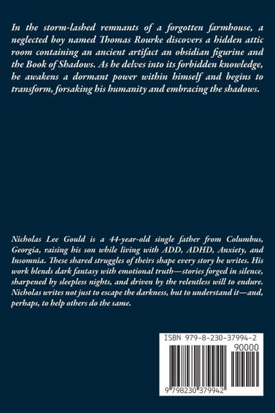 In the storm-lashed remnants of a forgotten farmhouse, a neglected boy named Thomas Rourke discovers a hidden attic room containing an ancient artifact-an obsidian figurine-and the Book of Shadows. As he delves into its forbidden knowledge, he awakens a dormant power within himself and begins to transform, forsaking his humanity and embracing the shadows.