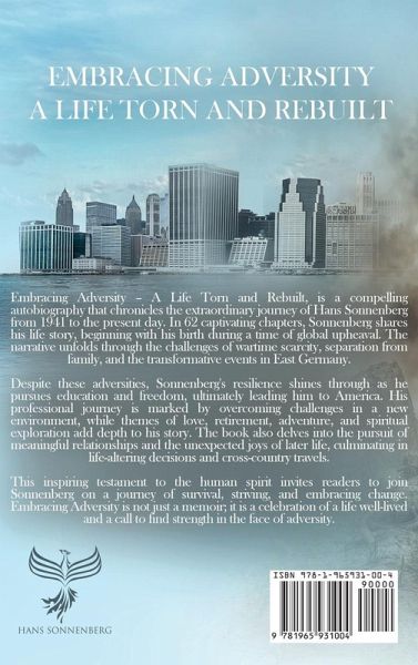 Embracing Adversity - A Life Torn and Rebuilt, is a compelling autobiography that chronicles the extraordinary journey of Hans Sonnenberg from 1941 to the present day. In 62 captivating chapters, Sonnenberg shares his life story, beginning with his birth during a time of global upheaval. The narrative unfolds through the challenges of wartime scarcity, separation from family, and the transformative events in East Germany. Despite these adversities, Sonnenberg's resilience shines through as he pursues education and freedom, ultimately leading him to America. His professional journey is marked by overcoming challenges in a new environment, while themes of love, retirement, adventure, and spiritual exploration add depth to his story. The book also delves into the pursuit of meaningful relationships and the unexpected joys of later life, culminating in life-altering decisions and cross-country travels. This inspiring testament to the human spirit invites readers to join Sonnenberg on a journey of survival, striving, and embracing change. Embracing Adversity is not just a memoir; it is a celebration of a life well-lived and a call to find strength in the face of adversity.