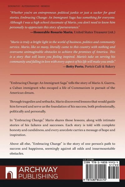 Mario A. Guerra escaped communist Cuba in search of the American dream, and while it didn’t come easy, he found it. Through tragedies and setbacks, he discovered lessons that would guide him forward and serve as the foundation of his success, both professionally and personally. In this memoir, he shares those lessons, along with intimate stories of his failures and successes. Each story is told with honesty and candidness, and every anecdote carries a message of hope and inspiration. From a challenging childhood, family tragedies, life as a businessman, holding political office, life as a public servant, and his religious work and philanthropy—Mario shares wisdom gleaned from his wide range of experiences. Mario’s experiences as a refugee gives us an opportunity to relate to immigrants who look to America as a beacon of hope.