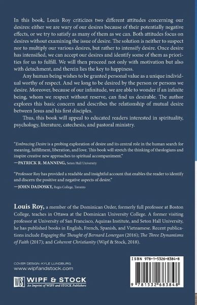 In this book, Louis Roy criticizes two different attitudes concerning our desires: either we are wary of our desires because of their potentially negative effects, or we try to satisfy as many of them as we can. Both attitudes focus on desires without examining the issue of desire. The solution is neither to suspect nor to multiply our various desires, but rather to intensify desire. Once desire has intensified, we can accept our desires and identify some of them as priorities for us to fulfill. We will then proceed not only with motivation but also with detachment, and therein lies the key to happiness. Any human being wishes to be granted personal value as a unique individual worthy of respect. And we long to be desired by the person or persons we desire. Moreover, because of our infinitude, we are able to wonder if an infinite being, whom we respect without reserve, can find us desirable. The author explores this basic concern and describes the relationship of mutual desire between Jesus and his first disciples. Thus, this book will appeal to educated readers interested in spirituality, psychology, literature, catechesis, and pastoral ministry.