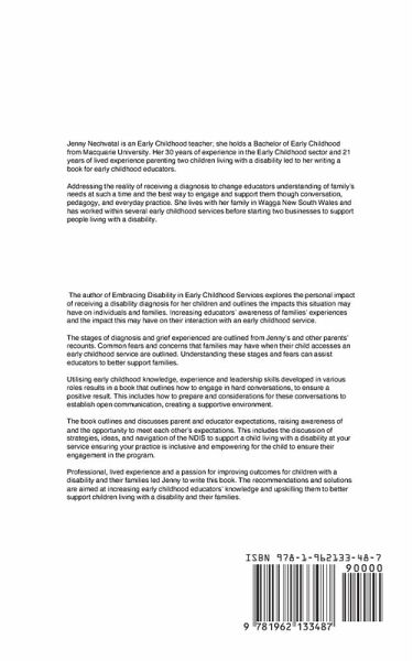 Jenny Nechvatal is an Early Childhood teacher; holding a Bachelor of Early Childhood from Macquarie University. Jenny combines over 30 years of experience in the Early Childhood sector with 21 years of lived experience parenting two children living with a disability to write a book for early childhood educators. The author of Embracing Disability in Early Childhood Services explores the personal impact of receiving a disability diagnosis for her children and outlines the impacts this situation may have on individuals and families. Increasing educators' awareness of families' experiences and the impact this may have on their interaction with an early childhood service. The stages of diagnosis and grief experienced are outlined from Jenny's and other parents' recounts. Common fears and concerns that families may have when their child accesses an early childhood service are outlined. Understanding these stages and fears can assist educators to better support families. Utilising early childhood knowledge, experience and leadership skills developed in various roles results in a book that outlines how to engage in hard conversations, to ensure a positive result. This includes how to prepare and considerations for these conversations to establish open communication, creating a supportive environment. The book outlines and discusses parent and educator expectations, raising awareness of and the opportunity to meet each other's expectations. This includes the discussion of strategies, ideas, and navigation of the NDIS to support a child living with a disability at your service ensuring your practice is inclusive and empowering for the child to ensure their engagement in the program. Leaders within an early childhood service can learn how to support themselves and their team during the diagnosis process and during the child's time at the service. An opportunity to explore individual and team pedagogy provides another perspective for educators to incorporate into daily practice. Professional, lived experience and a passion for improving outcomes for children with a disability and their families led Jenny to write this book. The recommendations and solutions are aimed at increasing early childhood educators' knowledge and upskilling them to better support children living with a disability and their families.