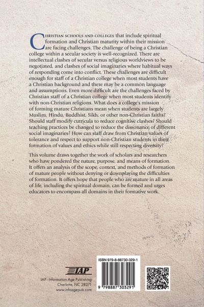 Christian schools and colleges that include spiritual formation and Christian maturity within their mission are facing challenges. The challenge of being a Christian college within a secular society is well-recognized. There are intellectual clashes of secular versus religious worldviews to be negotiated, and clashes of social imaginaries where habitual ways of responding come into conflict. These challenges are difficult enough for staff of a Christian college when most students have a Christian background and there may be a common language and assumptions. Even more difficult are the challenges faced by Christian staff of a Christian college when most students identify with non-Christian religions. What does a college's mission of forming mature Christians mean when students are largely Muslim, Hindu, Buddhist, Sikh, or other non-Christian faiths? Should staff modify curricula to reduce cognitive clashes? Should teaching practices be changed to reduce the dissonance of different social imaginaries? How can staff draw from Christian values of tolerance and respect to support non-Christian students in their formation of values and ethics while still respecting diversity? This volume draws together the work of scholars and researchers who have pondered the nature, purpose, and means of formation. It offers an analysis of the scope, context, and methods of formation of mature people without denying or downplaying the difficulties of formation. It offers hope that people who are mature in all areas of life, including the spiritual domain, can be formed and urges educators to encompass all domains in their formative work.
