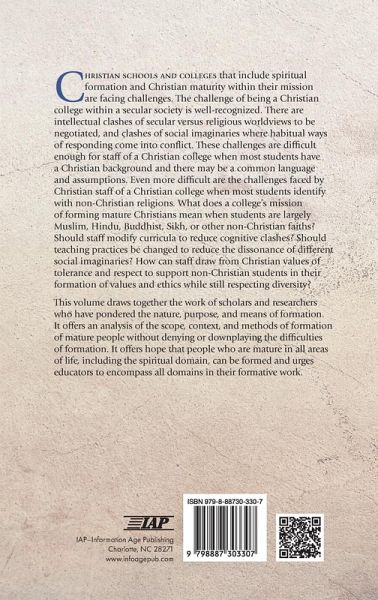 Christian schools and colleges that include spiritual formation and Christian maturity within their mission are facing challenges. The challenge of being a Christian college within a secular society is well-recognized. There are intellectual clashes of secular versus religious worldviews to be negotiated, and clashes of social imaginaries where habitual ways of responding come into conflict. These challenges are difficult enough for staff of a Christian college when most students have a Christian background and there may be a common language and assumptions. Even more difficult are the challenges faced by Christian staff of a Christian college when most students identify with non-Christian religions. What does a college's mission of forming mature Christians mean when students are largely Muslim, Hindu, Buddhist, Sikh, or other non-Christian faiths? Should staff modify curricula to reduce cognitive clashes? Should teaching practices be changed to reduce the dissonance of different social imaginaries? How can staff draw from Christian values of tolerance and respect to support non-Christian students in their formation of values and ethics while still respecting diversity? This volume draws together the work of scholars and researchers who have pondered the nature, purpose, and means of formation. It offers an analysis of the scope, context, and methods of formation of mature people without denying or downplaying the difficulties of formation. It offers hope that people who are mature in all areas of life, including the spiritual domain, can be formed and urges educators to encompass all domains in their formative work.