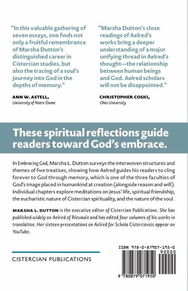 These spiritual reflections guide their readers toward God's embrace. In Embracing God, Marsha L. Dutton surveys the interwoven structures and themes of five treatises, showing how Aelred guides his readers to cling forever to God through memory, which is one of the three faculties of God's image placed in humankind at creation (alongside reason and will). Individual chapters explore meditations on Jesus' life, spiritual friendship, the eucharistic nature of Cistercian spirituality, and the nature of the soul.