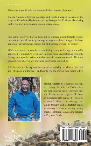 Embracing Life will help you become the best version of yourself. Emeka Anyiam, a licensed marriage and family therapist, focuses on the stages of life as defined by famous ego psychologist Erik Erickson, elaborating on his work by incorporating contemporary issues. The author observes that we tend not to embrace uncomfortable feelings or actions. Instead, we may attempt to suppress those thoughts, feelings, actions, or circumstances that do not fit the image we want to project. While it is easy for us to embrace comforting thoughts, feelings, and specific actions, it is imperative to we also embrace those discomforting thoughts, feelings, and specific actions and those sad circumstances as well. The more you embrace who you are, the more empowered you will be. Join the author as he explores the value of recognizing the whole of who you are-the good and the bad-and how to live the life you were meant to live.
