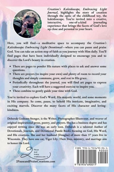 Would you like to be gently guided into journaling-with meditations, prayers and verses that assist you in meeting with the Lord, daily? Are you struggling with the busyness and stress of life, and are searching for a place, to pause? Do you long to have a closer relationship with God? Are you looking for a unique way to connect with Him? Are you uninspired by journals that are filled with only blank pages? Are you an experienced "journaler", yet are looking for an inspirational space, that allows room for your own creativity? Then this is the perfect journal for you! The Creation's Kaleidoscope, Embracing Light Journal highlights the story of Genesis 1, viewed through the optic of the childhood toy, the kaleidoscope. This beautifully woven meditative space, brings the facets of God's love, up-close and personal to your heart. You're invited into each entry, each scene. How? Each page is uniquely constructed to help you get to know who God really is, and to deepen your walk with Him. Come, take an action step of faith. Peer into these pages, that will help you discover the dimensions of God's character and grace. This journal can be used alone, but has been designed as the companion to the Creation's Kaleidoscope Embracing Light Devotional. It contains:Book excerpts (plus lots of new material): Deborah's photography, poetry, prose and devotional thoughts Prayers, to inspire your own Scriptural promises Lots of room to allow God to speak to your heart Thoughtful questions for you and/or your small group Art pages to inspire your creativity These, have been intricately woven to gently guide you into a journaling experience that helps you discover God's nature through creation. Whether you've never journaled before, or are seasoned in this meditative style of meeting with God, we encourage you to get your copy today!