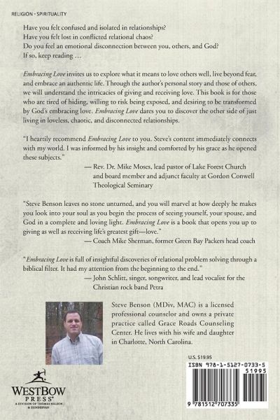 Have you felt confused and isolated in relationships? Have you felt lost in conflicted relational chaos? Do you feel an emotional disconnection between you, others, and God? If so, keep reading ... Embracing Love invites us to explore what it means to love others well, live beyond fear, and embrace an authentic life. Through the author's personal story and those of others, we will understand the intricacies of giving and receiving love. This book is for those who are tired of hiding, willing to risk being exposed, and desiring to be transformed by God's embracing love. Embracing Love dares you to discover the other side of just living in loveless, chaotic, and disconnected relationships. "I heartily recommend Embracing Love to you. Steve's content immediately connects with my world. I was informed by his insight and comforted by his grace as he opened these subjects." - Rev. Dr. Mike Moses, lead pastor of Lake Forest Church and board member and adjunct faculty at Gordon Conwell Theological Seminary "Steve Benson leaves no stone unturned, and you will marvel at how deeply he makes you look into your soul as you begin the process of seeing yourself, your spouse, and God in a complete and loving light. Embracing Love is a book that opens you up to giving as well as receiving life's greatest gift-love." - Coach Mike Sherman, former Green Bay Packers head coach "Embracing Love is full of insightful discoveries of relational problem solving through a biblical filter. It had my attention from the beginning to the end." - John Schlitt, singer, songwriter, and lead vocalist for the Christian rock band Petra