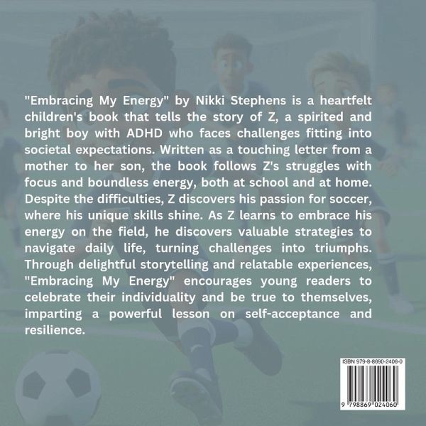 "Embracing My Energy" is an inspiring, heartwarming children's story about finding strength in differences and celebrating unique talents. Perfect for young soccer fans, kids with ADHD, and friends or siblings who want to better understand what it's like to live with ADHD. Meet Z, a young boy who loves soccer but sometimes struggles to focus. With his boundless energy and big dreams, he faces challenges in ways only a child with ADHD might -- but he also learns to turn those challenges into strengths. Guided by his passion for the game, he finds new ways to handle obstacles both on and off the field, discovering that his "extra energy" can help him succeed. Who this book is for:Children with ADHD looking for a relatable story that builds confidence and celebrates their abilities. Friends, siblings, and classmates of kids with ADHD who want to understand and support their loved ones. Young soccer players and sports fans who love stories about resilience, teamwork, and overcoming challenges. Parents and educators seeking a positive, educational story to introduce ADHD concepts to children. With engaging illustrations and an empowering message, "Embracing My Energy" teaches kids about empathy, resilience, and self-confidence -- while encouraging them to embrace their unique strengths. Key Themes: ADHD in children, resilience, understanding and empathy, soccer, teamwork, positive self-image, overcoming challenges, kids' mental health.