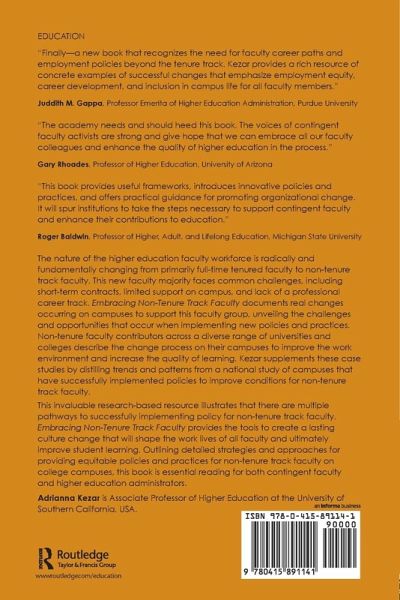 The nature of the higher education faculty workforce is radically and fundamentally changing from primarily full-time tenured faculty to non-tenure track faculty. This new faculty majority faces common challenges, including short-term contracts, limited support on campus, and lack of a professional career track. Embracing Non-Tenure Track Faculty documents real changes occurring on campuses to support this faculty group, unveiling the challenges and opportunities that occur when implementing new policies and practices. Non-tenure faculty contributors across a diverse range of universities and colleges explore the change process on their campuses to improve the work environment and increase the quality of learning. Kezar supplements these case studies by distilling trends and patterns from a national study of campuses that have successfully implemented policies to improve conditions for non-tenure track faculty. This invaluable research-based resource illustrates that there are multiple pathways to successfully implementing policy for non-tenure track faculty. Embracing Non-Tenure Track Faculty provides the tools to create a lasting culture change that will shape the work lives of all faculty and ultimately improve student learning. Outlining detailed strategies and approaches for providing equitable policies and practices for non-tenure track faculty on college campuses, this book is essential reading for both contingent faculty and higher education administrators.