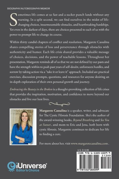 Sometimes life comes at us fast and a sucker punch lands without any warning. In a split second, we can find ourselves in the midst of life-changing choices, insurmountable obstacles, and heartbreaking hardships. Yet even in the darkest of days, there are choices presented to each of us with the power to prompt life to change its course. Within thirty candid chapters of conflict and resolution, Margarete Cassalina shares compelling stories of loss and perseverance through obstacles with authenticity and humor. Each life crisis shared provides a valuable message of choices, decisions, and the power of teachable lessons. Throughout her presentation, Margarete reminds all of us that we are not defined by our pasts and have the strength within to push past years of self-doubt, unforeseen hurdles, and sorrow by taking action via a "take it or leave it" approach. Included are practical exercises, discussion prompts, questions, and resources for anyone desiring an in-depth exploration of their own personal growth and journey. Embracing the Beauty in the Broken is a thought-provoking collection of life crises that provides the inspiration, motivation, and confidence to move beyond our obstacles and live our best lives.