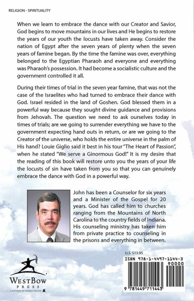 When we learn to embrace the dance with our Creator and Savior, God begins to move mountains in our lives and He begins to restore the years of our youth the locusts have taken away. Consider the nation of Egypt after the seven years of plenty when the seven years of famine began. By the time the famine was over, everything belonged to the Egyptian Pharaoh and everyone and everything was Pharaoh's possession. It had become a socialistic culture and the government controlled it all. During their times of trial in the seven year famine, that was not the case of the Israelites who had turned to embrace their dance with God. Israel resided in the land of Goshen. God blessed them in a powerful way because they sought divine guidance and provisions from Jehovah. The question we need to ask ourselves today in times of trials; are we going to surrender everything we have to the government expecting hand outs in return, or are we going to the Creator of the universe, who holds the entire universe in the palm of His hand? Louie Giglio said it best in his tour "The Heart of Passion", when he stated "We serve a Ginormous God!" It is my desire that the reading of this book will restore unto you the years of your life the locusts of sin have taken from you so that you can genuinely embrace the dance with God in a powerful way.