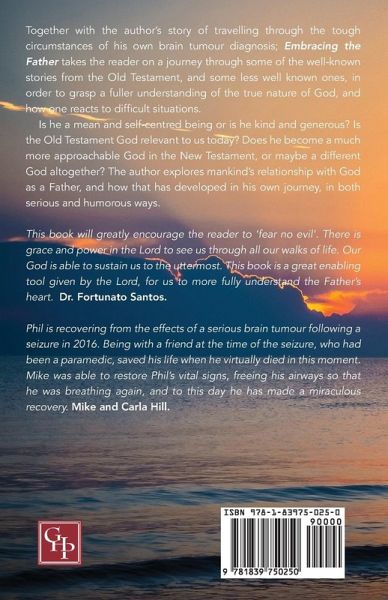 Together with the author's story of travelling through the tough circumstances of his own brain tumour diagnosis; Embracing the Father takes the reader on a journey through some of the well-known stories from the Old Testament, and some less well known ones, in order to grasp a fuller understanding of the true nature of God, and how one reacts to difficult situations. Is he a mean and self-centred being or is he kind and generous? Is the Old Testament God relevant to us today? Does he become a much more approachable God in the New Testament, or maybe a different God altogether? The author explores mankind's relationship with God as a Father, and how that has developed in his own journey, in both serious and humorous ways. This book will greatly encourage the reader to 'fear no evil'. There is grace and power in the Lord to see us through all our walks of life. Our God is able to sustain us to the uttermost. This book is a great enabling tool given by the Lord, for us to more fully understand the Father's heart. Dr. Fortunato Santos. Phil is recovering from the effects of a serious brain tumour following a seizure in 2016. Being with a friend at the time of the seizure, who had been a paramedic, saved his life when he virtually died in this moment. Mike was able to restore Phil's vital signs, freeing his airways so that he was breathing again, and to this day he has made a miraculous recovery. Mike and Carla Hill.
