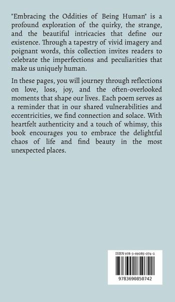 "Embracing the Oddities of Being Human" is a profound exploration of the quirky, the strange, and the beautiful intricacies that define our existence. Through a tapestry of vivid imagery and poignant words, this collection invites readers to celebrate the imperfections and peculiarities that make us uniquely human. In these pages, you will journey through reflections on love, loss, joy, and the often-overlooked moments that shape our lives. Each poem serves as a reminder that in our shared vulnerabilities and eccentricities, we find connection and solace. With heartfelt authenticity and a touch of whimsy, this book encourages you to embrace the delightful chaos of life and find beauty in the most unexpected places.