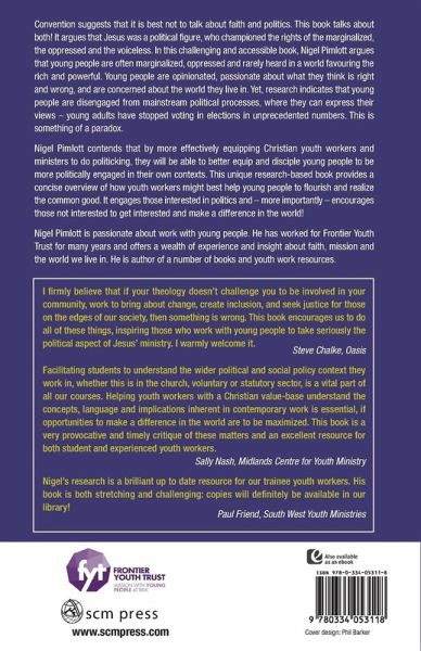 Convention suggests it is best not to talk about faith and politics: this book talks about both! It argues that Jesus was a political figure who championed the rights of the marginalised, the oppressed and voiceless. In this challenging and accessible book, Nigel Pimlott argues young people are often marginalised, oppressed and rarely heard in a world favouring the rich and powerful. Young people are opinionated, passionate about what they think is right and wrong, and are concerned about the world they live in. Yet research indicates young people are disengaged from mainstream political processes where they can express their views - young adults have stopped voting in elections in unprecedented numbers. This is something of a paradox. Nigel contends that by more effectively equipping Christian youth workers and ministers to do politicking, they will be able to better equip and disciple young people to be more politically engaged in their own contexts. This unique research-based book provides a concise overview of how youth workers might best help young people flourish and realise the common good. It engages those interested in politics - and more importantly - encourages those not interested to get interested and make a difference in the world!