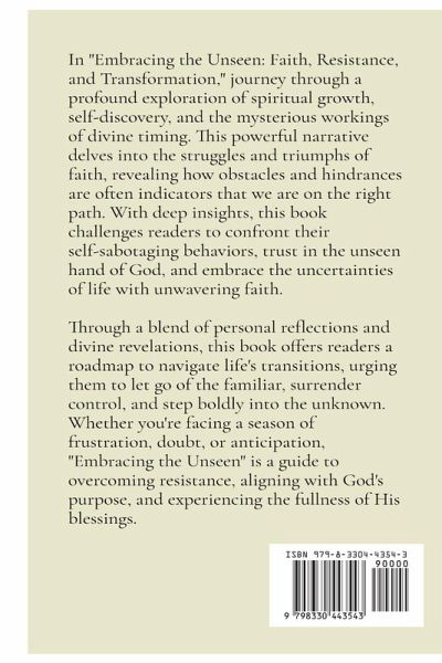 In "Embracing the Unseen: Faith, Resistance, and Transformation," journey through a profound exploration of spiritual growth, self-discovery, and the mysterious workings of divine timing. This powerful narrative delves into the struggles and triumphs of faith, revealing how obstacles and hindrances are often indicators that we are on the right path. With deep insights, this book challenges readers to confront their self-sabotaging behaviors, trust in the unseen hand of God, and embrace the uncertainties of life with unwavering faith. Through a blend of personal reflections and divine revelations, this book offers readers a roadmap to navigate life's transitions, urging them to let go of the familiar, surrender control, and step boldly into the unknown. Whether you're facing a season of frustration, doubt, or anticipation, "Embracing the Unseen" is a guide to overcoming resistance, aligning with God's purpose, and experiencing the fullness of His blessings.