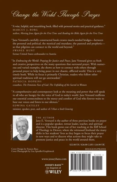 "A wise, helpful and nourishing book, filled with personal stories and practical guidance." --Marcus J. Borg, author, Meeting Jesus Again for the First Time and Reading the Bible Again for the First Time "Jane Vennard's carefully constructed book creates much-needed bridges-- between the personal and political, the mystical and mundane, the pastoral and prophetic-- so that pilgrims can connect to the world and beyond." --Swanee Hunt, former United States Ambassador to Austria "In Embracing the World: Praying for Justice and Peace, Jane Vennard gives us fresh and creative perspectives on the many questions that surround prayer. With numerous and varied examples, she shows us how to connect with others through personal prayer to help bring peace in our chaotic, afflicted world. This is a very timely book. While its focus is primarily Christian, readers who follow other spiritual traditions will not go unrewarded." --Patricia Hopkins, coauthor, The Feminine Face of God: the Unfolding of the Sacred in Women "A comprehensive and contemporary look at the meaning and power that will speak to all who are hungry for the voice of God in today's world. Jane Vennard reaffirms our essential connectedness to the mercy and comfort of God who forever waits to hear our voices and listen to our silences." --Edwina Gateley, minister, speaker, poet, and author of I Hear a Seed Growing