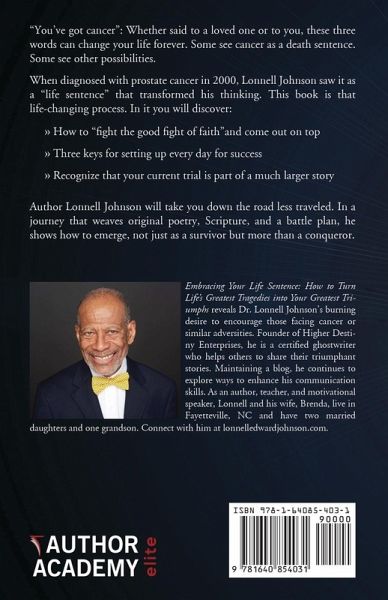 When diagnosed with prostate cancer in 2000, Lonnell Johnson did not see "a death sentence." Instead, he saw a "life sentence" that transformed his thinking. In Embracing Your Life Sentence: How to Turn Life’s Greatest Tragedies into Your Greatest Triumphs, he shares his holistic strategy to overcome any adversity. Weaving original poetry and Scripture into his battle plan, Johnson shows how he emerged, as not just a survivor but more than a conqueror.